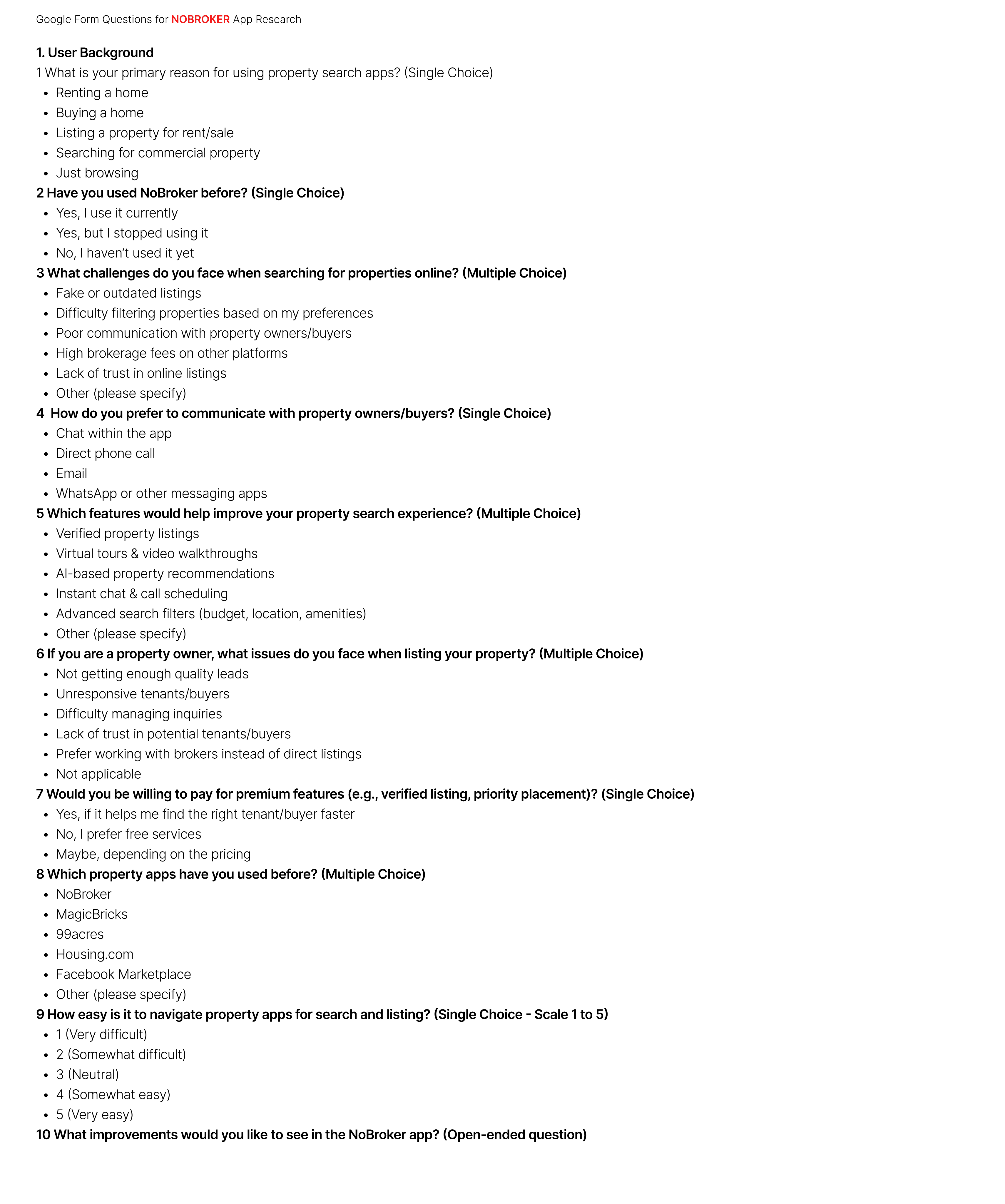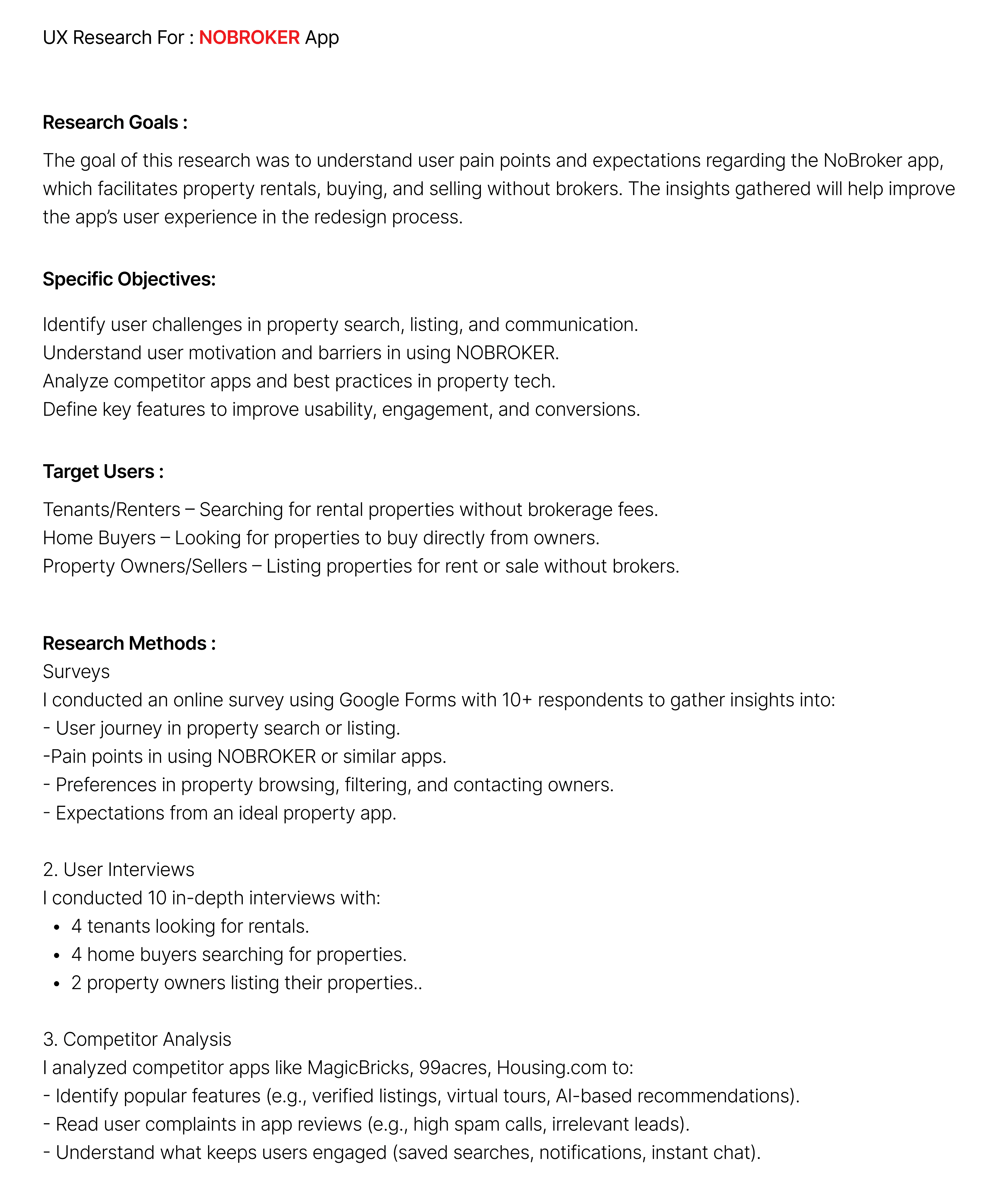 NoBroker research aims to understand user needs and analyze competitors to define features that improve search, communication, documents, and community engagement for a better experience.