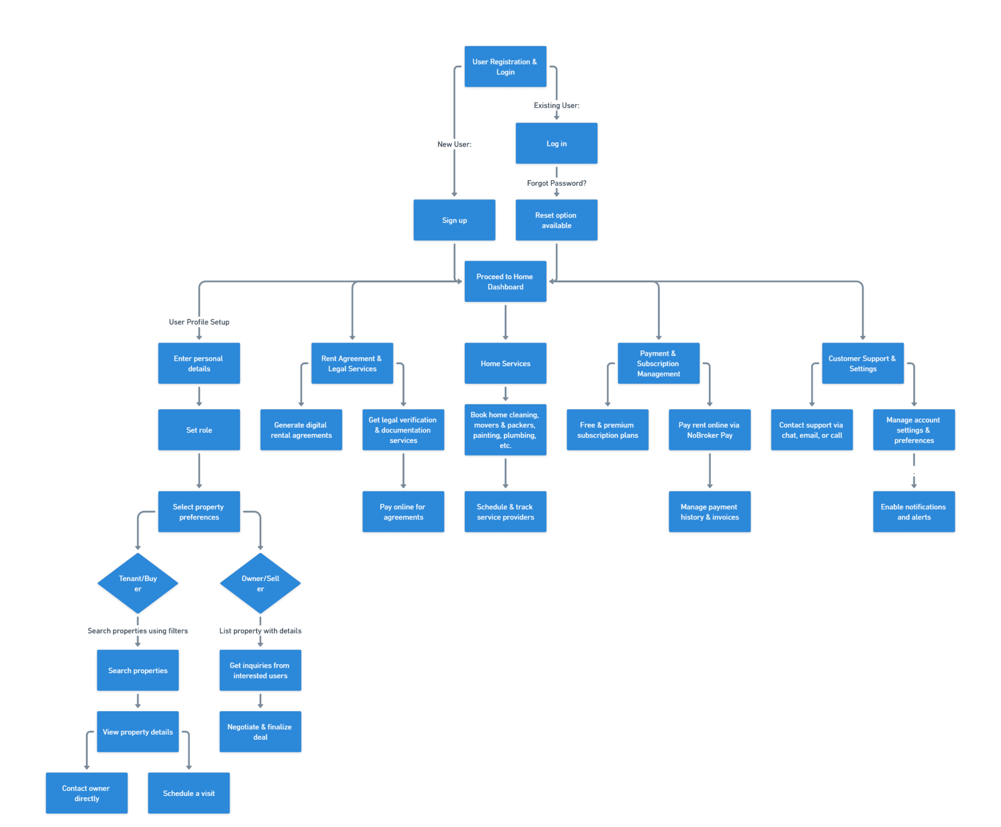 The user flow helps renters, buyers, and owners search properties, apply filters, view details, connect with owners, and manage transactions easily on NoBroker.