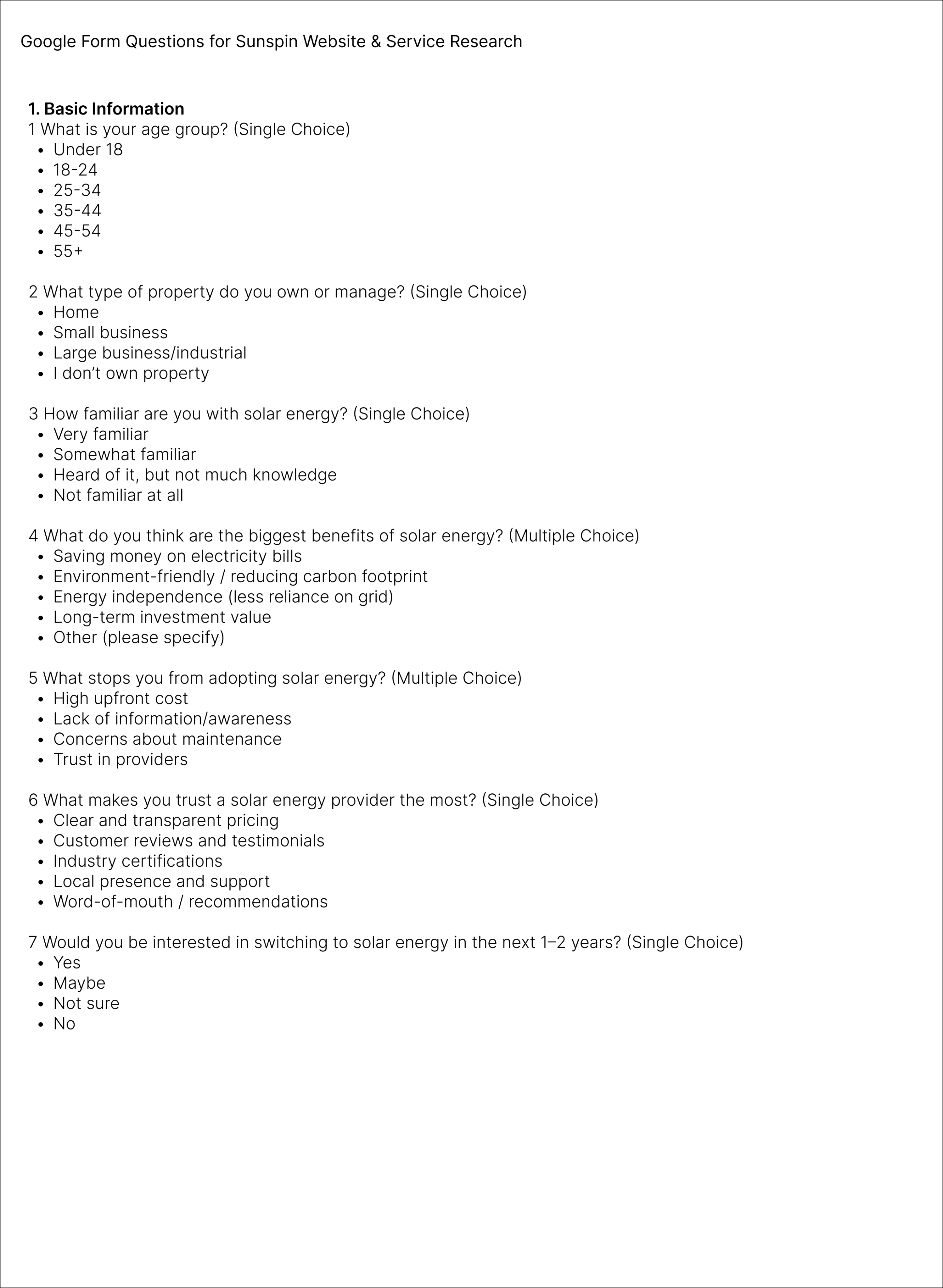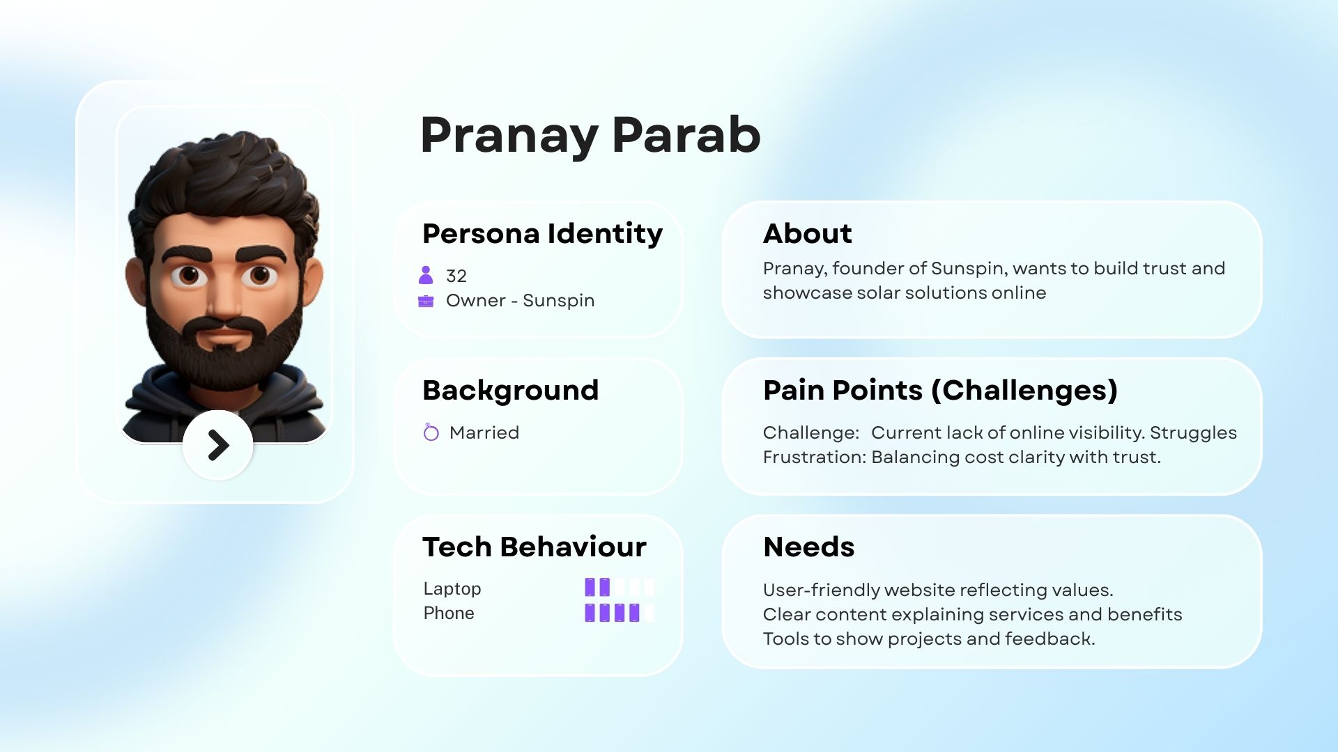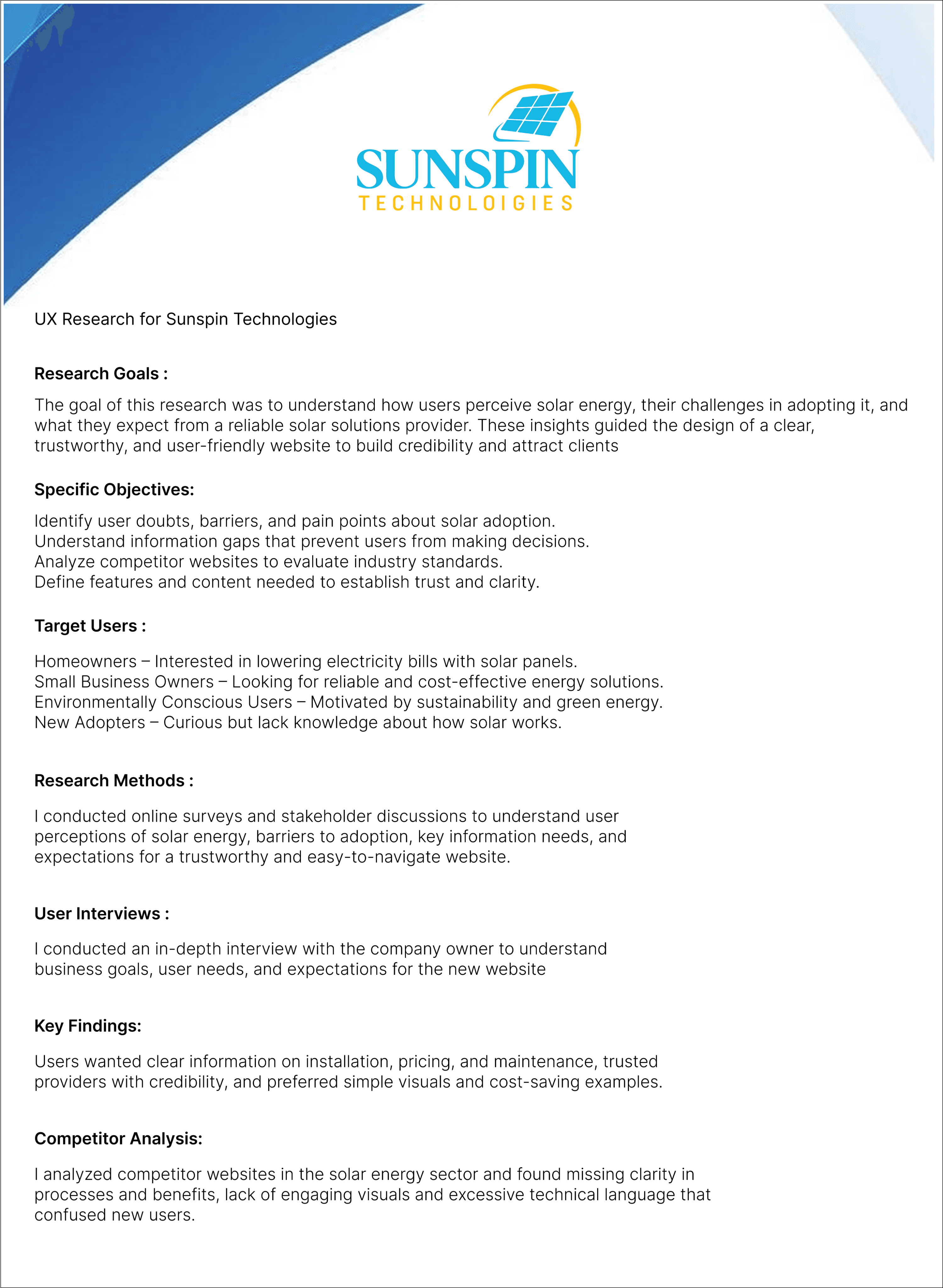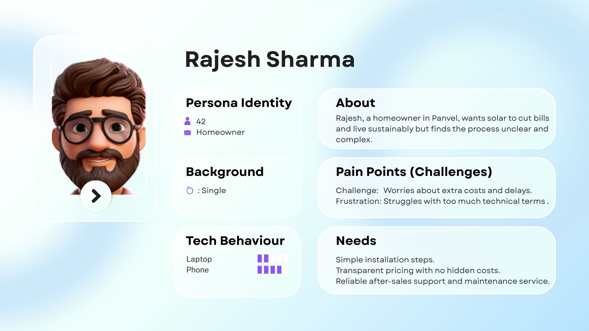 In this project, we defined clear personas of homeowners and business owners exploring solar energy. The solution was designed to address their needs and build trust as primary users.