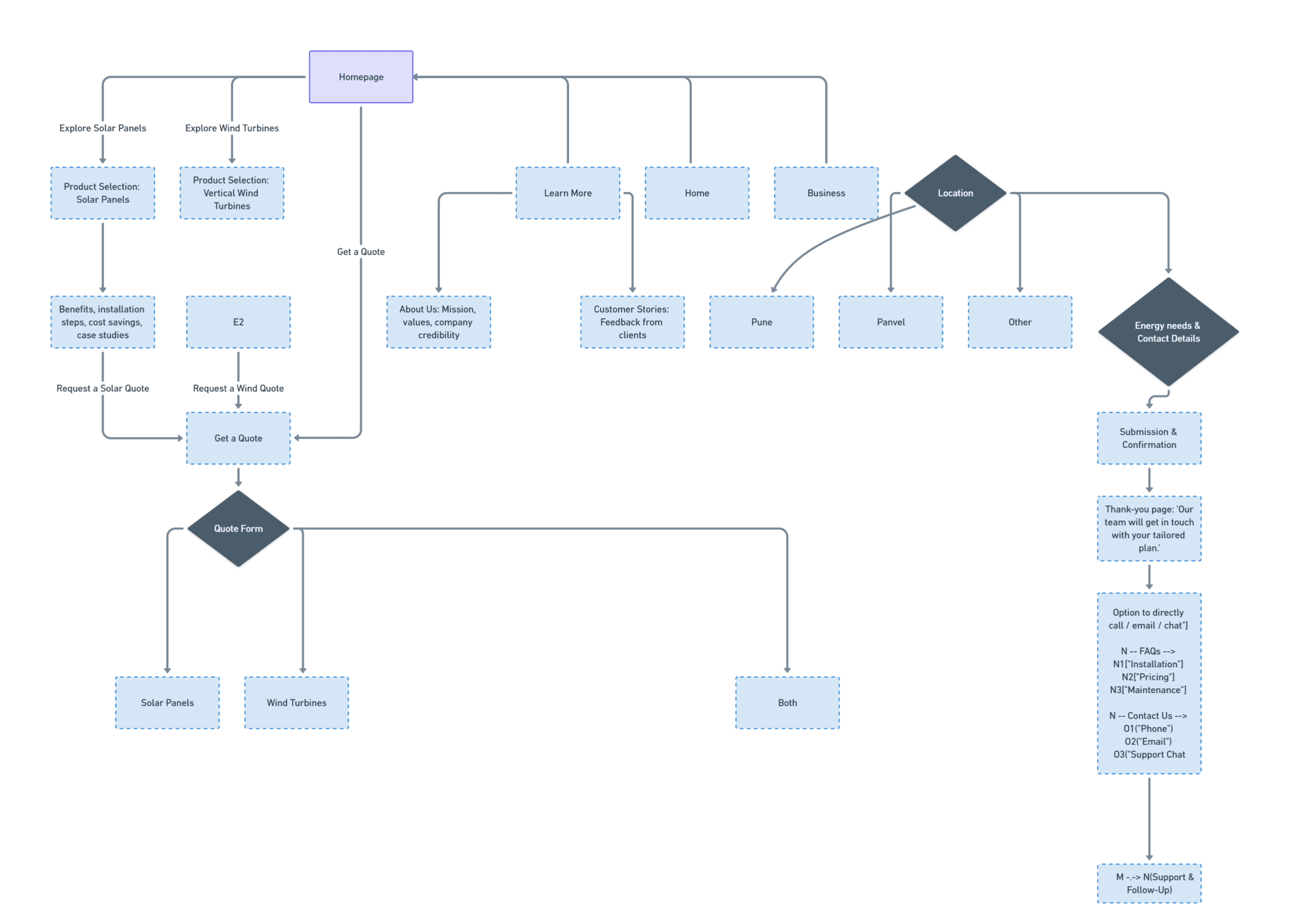 The user flow helps homeowners and business owners explore solar and wind solutions, understand benefits, compare options, and contact Sunspin easily.