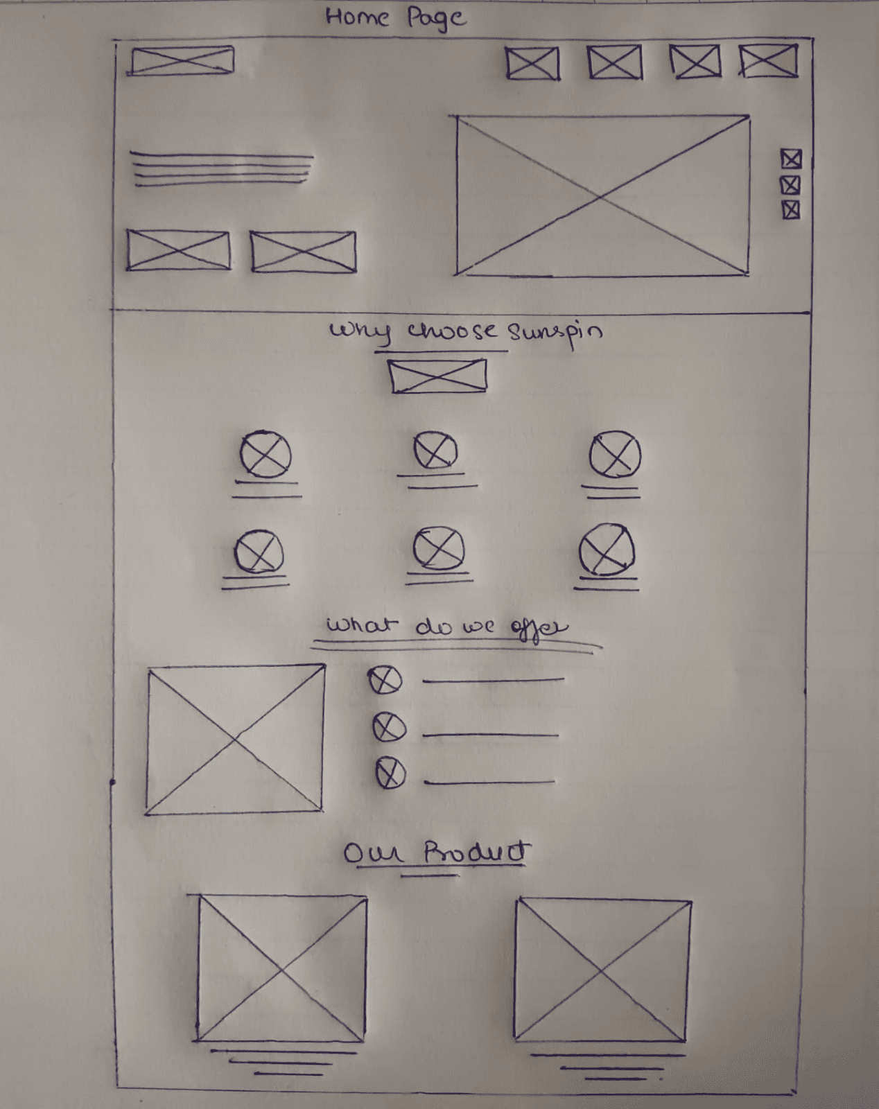 Paper wireframes helped sketch out ideas for Sunspin’s website, focusing on clear navigation, service details, and user needs. They allowed quick iterations and early feedback before moving to digital wireframes.